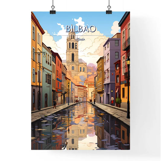 Bilbao, Spain - Art print of a water canal with buildings and a tower in the background