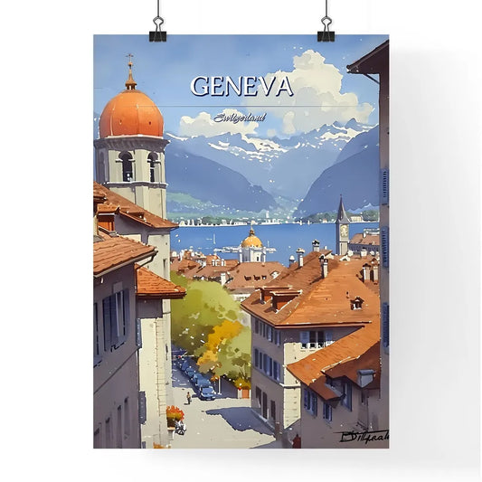 Geneva, Switzerland, - Art print of a view of a town from a window