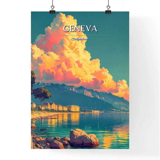 Geneva, Switzerland, - Art print of a body of water with a beach and buildings and a mountain in the background