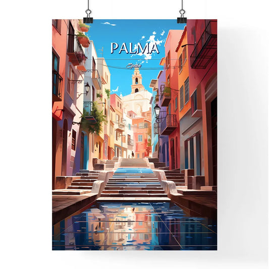 Palma, Spain - Art print of a street with stairs and water in front of buildings