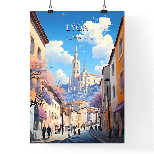Lyon, France - Art print of a street with people walking down it and a castle in the distance