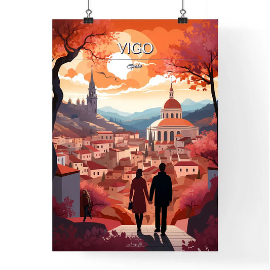 Vigo, Spain - Art print of a man and woman walking on a path in a town