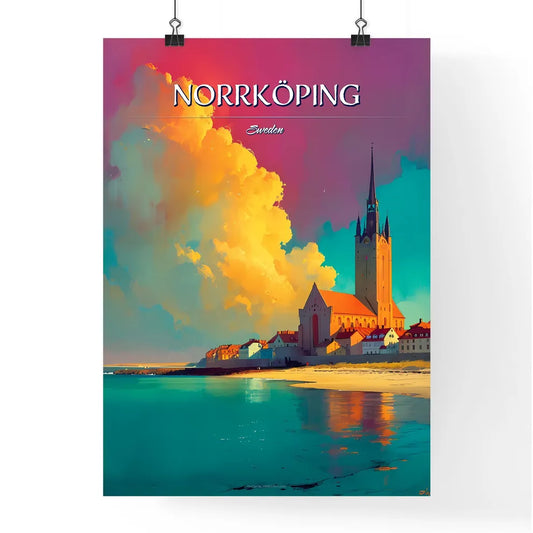 Norrköping, Sweden, - Art print of a building with a tower and a body of water