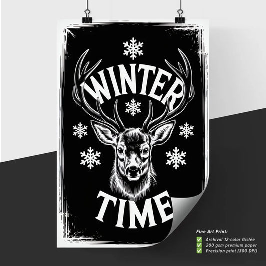 Winter-themed artwork featuring a deer and snowflakes – Fine Art Poster Inspired by Vintage Advertisements