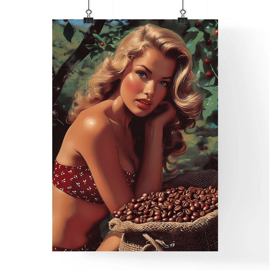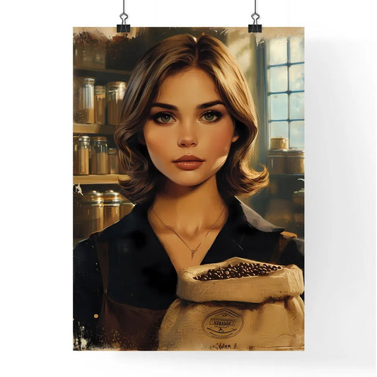 The vintage pin up Coffee girl isolated on white - Art print of a woman holding a bag of coffee beans
