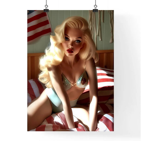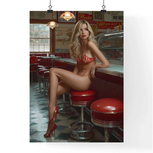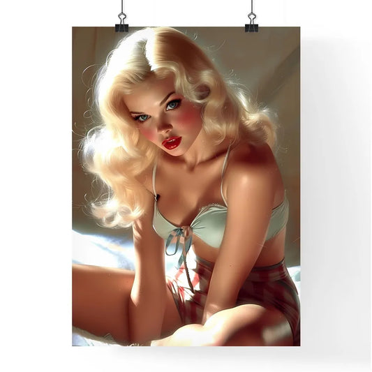Pin up style, beautiful composition, dramatic pose - Art print of a woman sitting on a bed