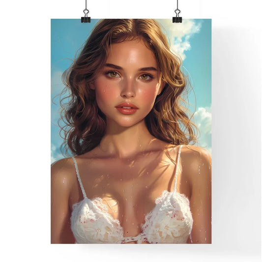 Pin up style, beautiful composition, dramatic pose - Art print of a woman in a garment sitting on a bed