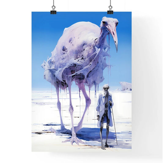 A Poster of A rider on a large ostrich - A Man Standing Next To A Large Bird
