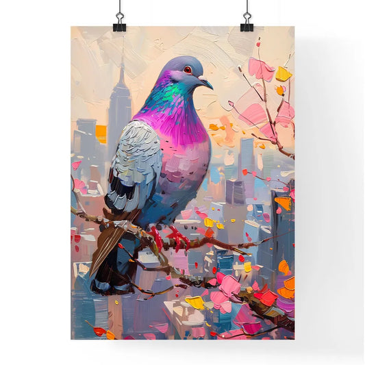 Impressionist Fine Art Painting of a Pigeon Sitting on a Branch, Vibrant Bird with Bold Colors