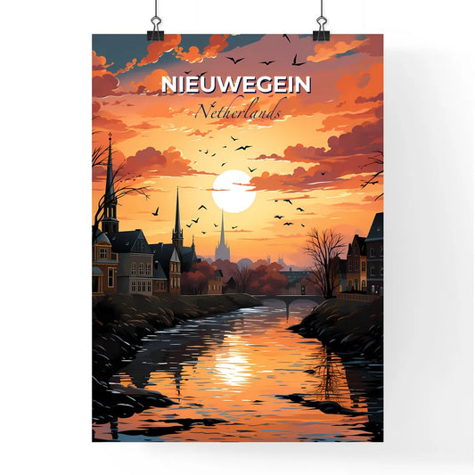 Nieuwegein, Netherlands, A Poster of a river with a bridge and a city with birds flying over it