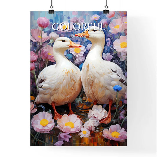 Two Ducks Standing In A Pond Surrounded By Flowers