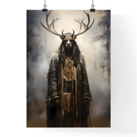 A Poster of an oil painting of a black elk in the fog - A Person In A Garment With Antlers