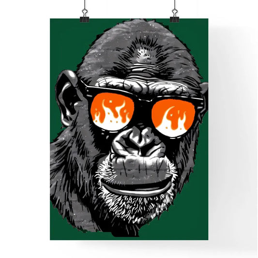 Ape T-Shirt Logo: Animated Chromatic Gorilla in Sunglasses with Flames in Gadgetpunk Style on Green Background