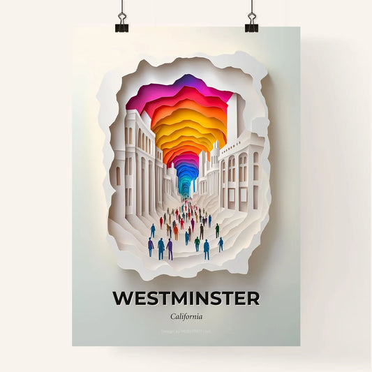 Vivid Westminster, California - a group of people walking down a street under a rainbow colored umbrella
