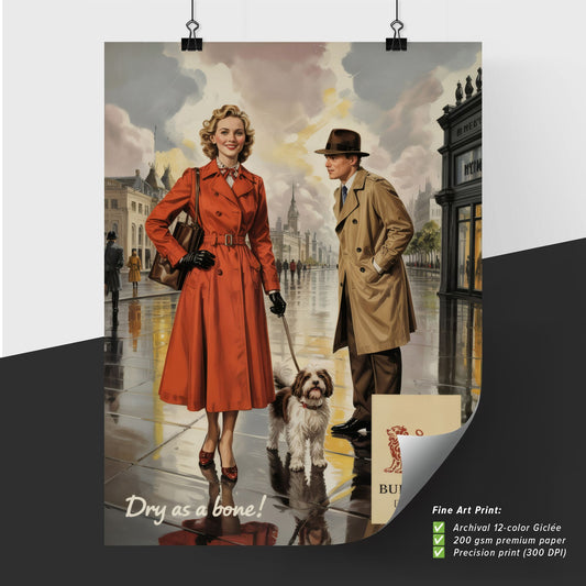 Charming Couple in Iconic Burberry Rainwear Enjoying a Stylish Walk with Their Dog on a Rainy Day.