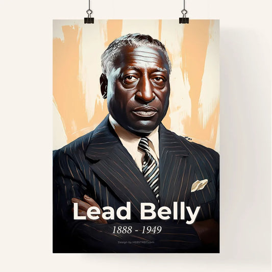Portrait of Lead Belly, 1888 - 1949. Impressionistic painting of a man in a suit with his arms crossed.