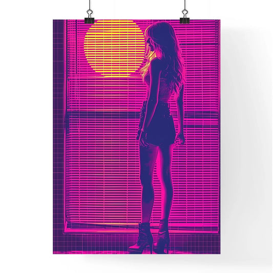 A standing woman, listining a music illustrations vector design - Art print of a woman standing in front of a window with a sun behind her