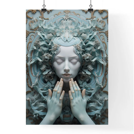 A Poster of a hand drawn painting made from clay - A Statue Of A Woman With Hands In Front Of Her Face
