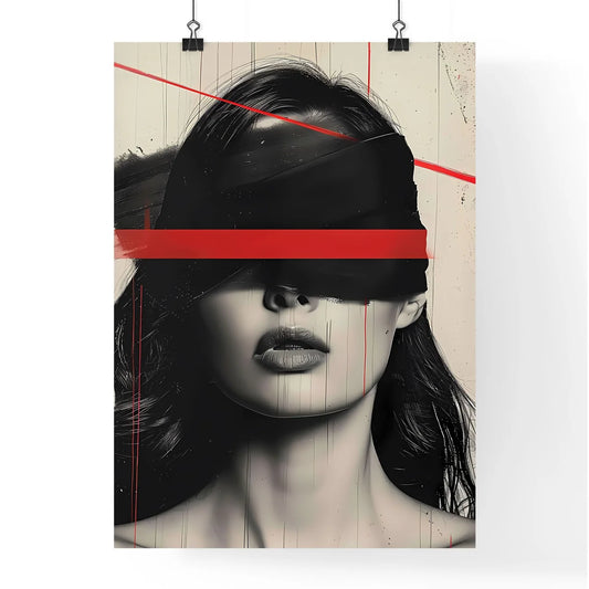 Black and grey shaded portrait of a woman with a red stripe covering her face, digital collage, focus on art