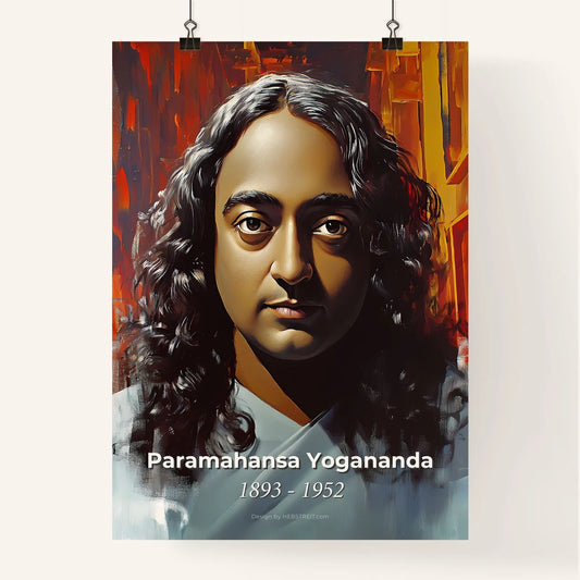 Portrait of Paramahansa Yogananda, 1893 - 1952. Impressionistic painting of a man with long hair wearing a white robe.