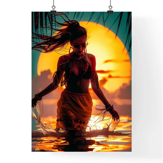 Tropical Sunset Dance Festival Flyer Featuring Woman in Vibrant Art Painting with Sunglasses and Garment