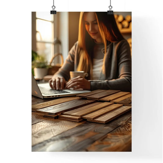 Female Interior Designer Working on Computer, Choosing Wood and Paint Samples, Focused on Art