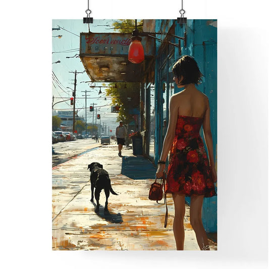 A Poster of a girl is walking with a black dog - A Woman Walking A Dog On A Sidewalk