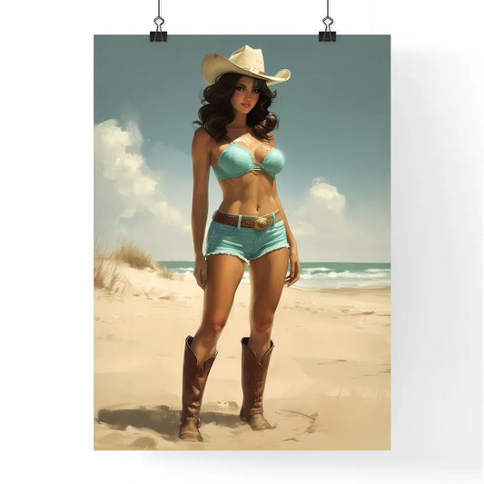 Cowgirl woman beautiful, shorts, boots, cowboy hat, ascot - Art print of a woman in a garment and cowboy boots on a beach