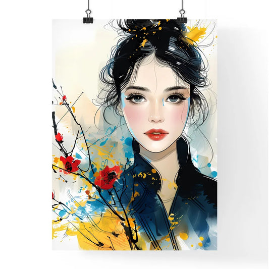 Nostalgic Orientalist Minimalist Beauty | Vibrant Manga Style Feminine Curves | Delicate High-Resolution Ink Line Illustration of Long-Haired Woman with Flowers