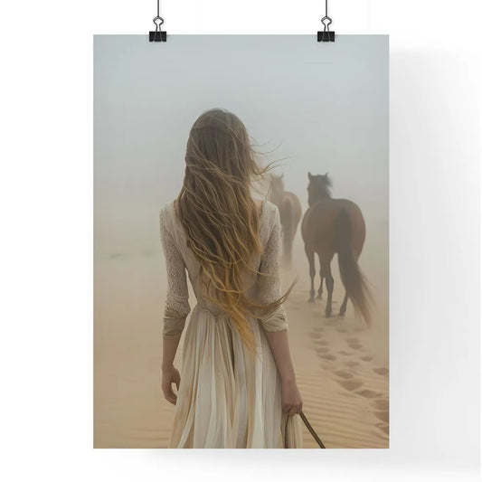 Expressive woman and horses in desert sunrise landscape, acrylic painting, digital art