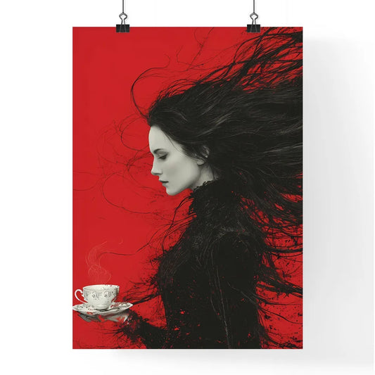 Woman with very long hair, drinks tea, full body - Art print of a woman with long hair holding a tea cup