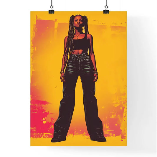 A standing woman, listining a music illustrations vector design - Art print of a woman with long braids wearing black pants and a tank top