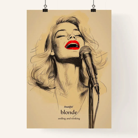 beautiful, blonde, smiling and winking, A Poster of a drawing of a woman singing into a microphone