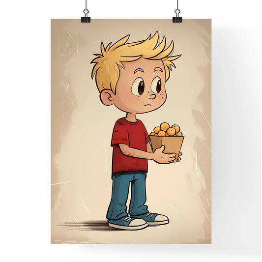 Vintage cartoon boy blonde hair red shirt blue pants holding ice cream paper box muted colors thick lines low detail