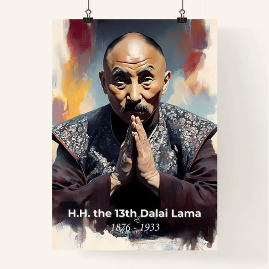 Portrait of H.H. the 13th Dalai Lama, 1876 - 1933. Impressionistic painting of a man with a mustache and a mustache holding his hands together.