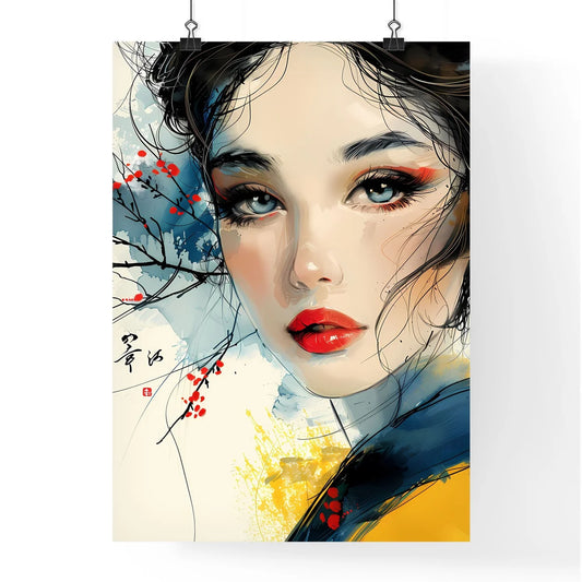 Seductive Feminine Orient-Style Painting With Blue Eyes, Red Lips, Delicate Lines and Vibrant Colors High Resolution