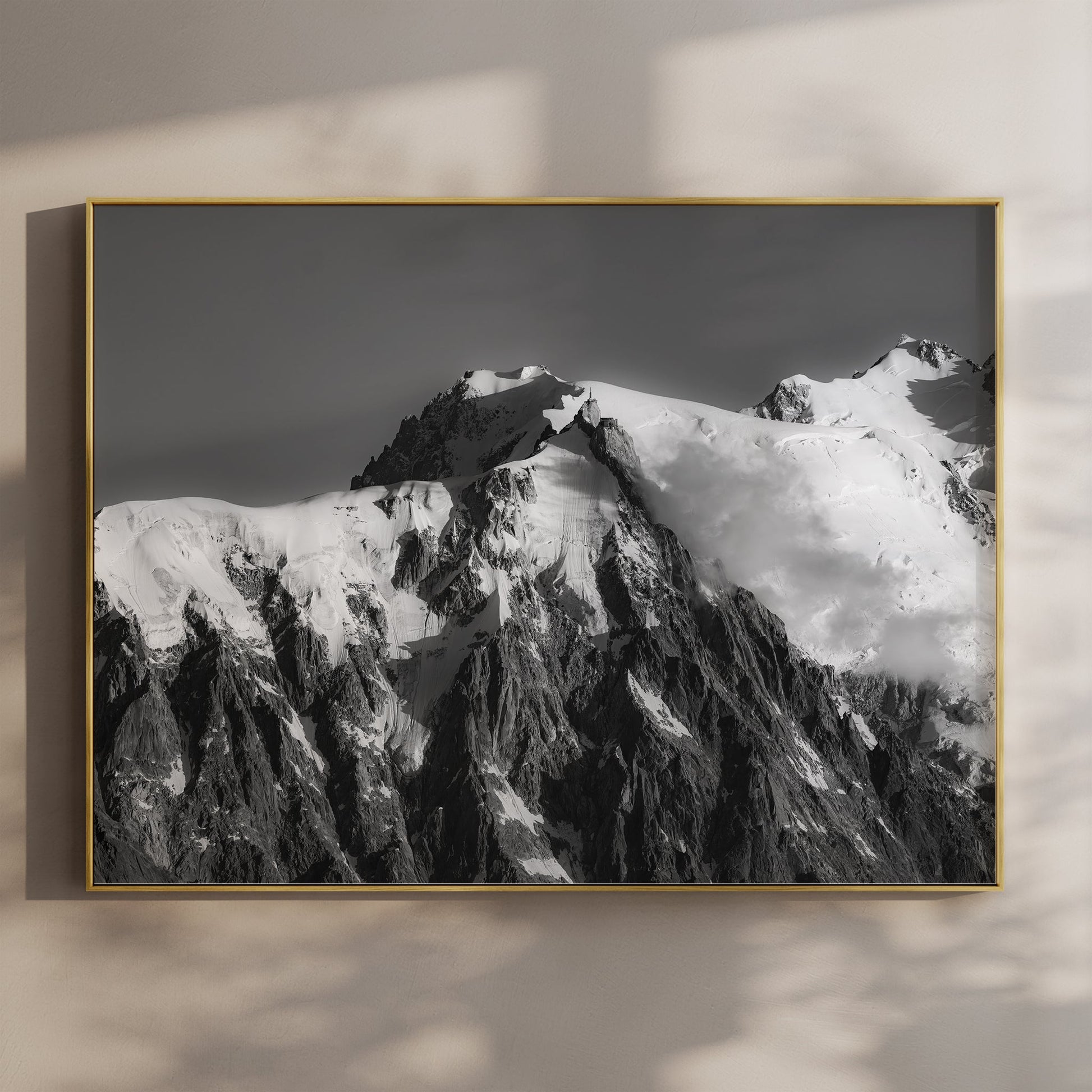 Capture the dramatic beauty of Chamonix with this black and white Aiguille du Midi wall art print. Perfect for modern and minimalist decor, this fine art photograph showcases the rugged alpine peaks in striking detail.
