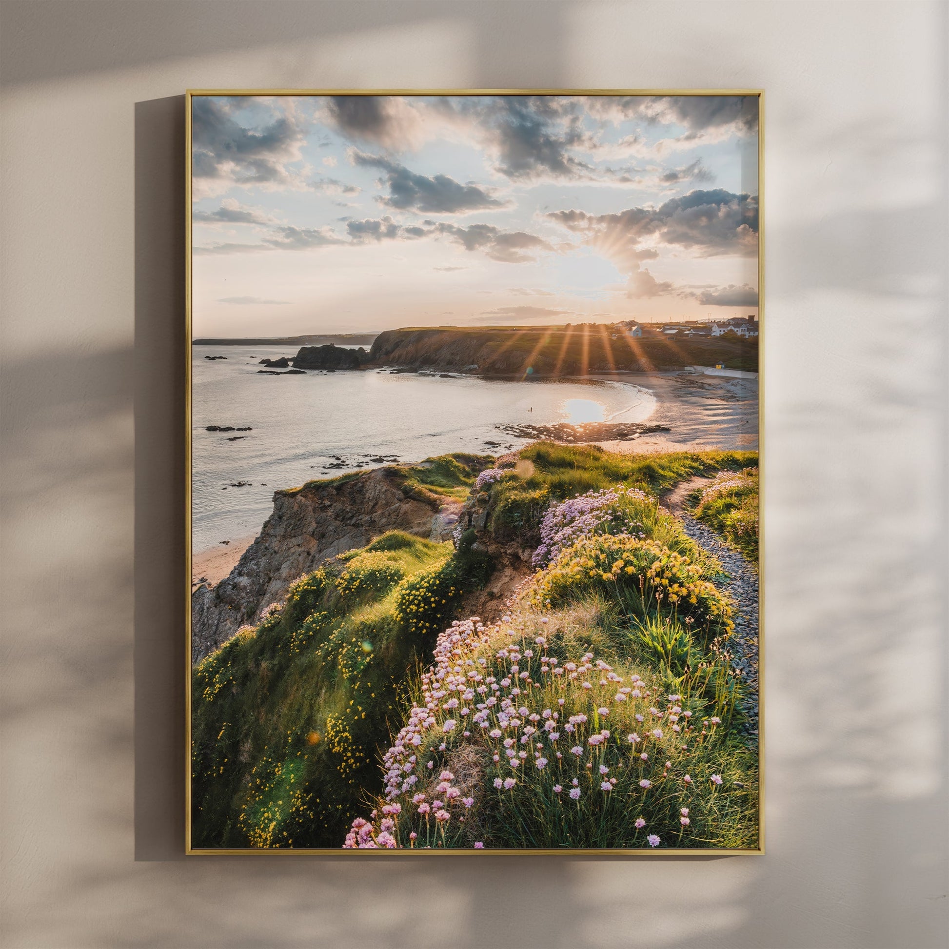 A peaceful sunrise over Annestown Beach captured from the wildflower-covered cliffs of Ireland's Copper Coast. The golden light spills across the sand and fields, casting long shadows and bringing the early morning to life. This fine art photography print celebrates the natural beauty of the Irish coastline with vivid colour and detail—perfect for any space inspired by nature, coastal living, or travel.