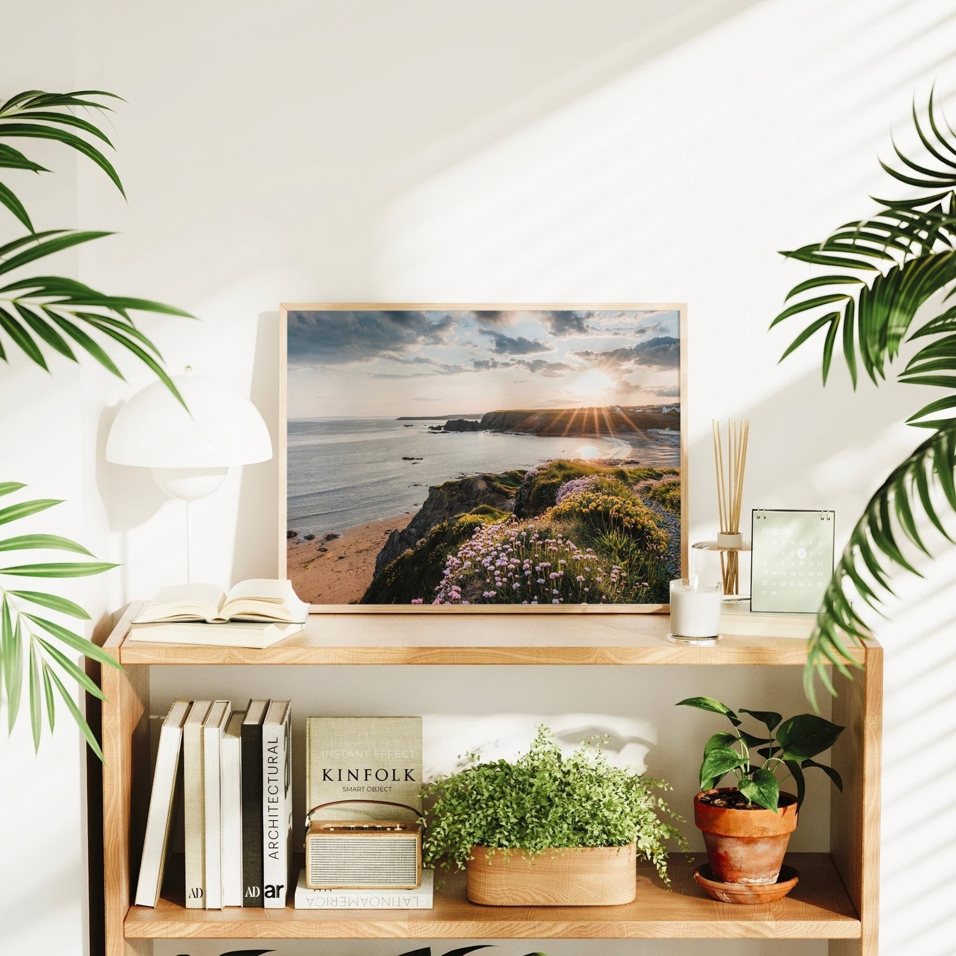 Golden sunbeams stretch across the sea as wildflowers bloom along the cliffs of Annestown Beach, County Waterford. Captured during a spring sunset, this coastal landscape print brings the calm and colour of the Irish coast into your space. Perfect for nature lovers, travellers, or anyone with a connection to Ireland’s southern shores.