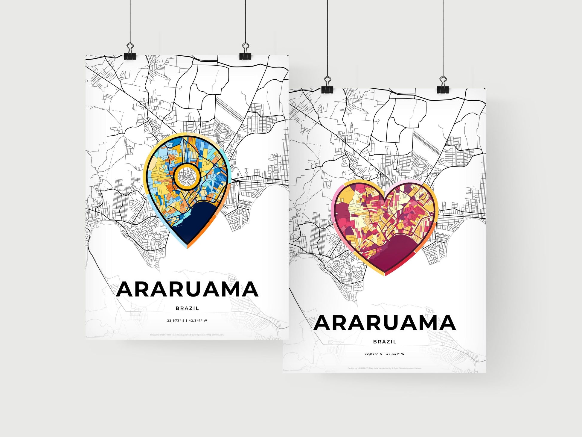 Our map of Araruama Brazil shows minimalist designed roads, railroads and waterways combined with colorful urban areas within one icon.