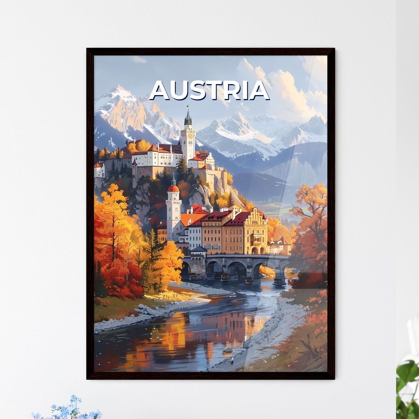 Immerse yourself in the captivating beauty of the Austrian countryside with this vibrant art print. Nestled amidst rolling hills and verdant landscapes, the majestic castle stands tall, its grandeur enhanced by the vibrant colors of the surrounding nature. A graceful bridge spans the river, inviting you to explore the serene surroundings painted in a graphic style that adds a touch of contemporary charm to the timeless scene. This print not only captures the essence of Austria's enchanting landscapes but also allows you to bring a piece of its magic into your own space, whether as a thoughtful gift or as a stunning addition to your home decor.