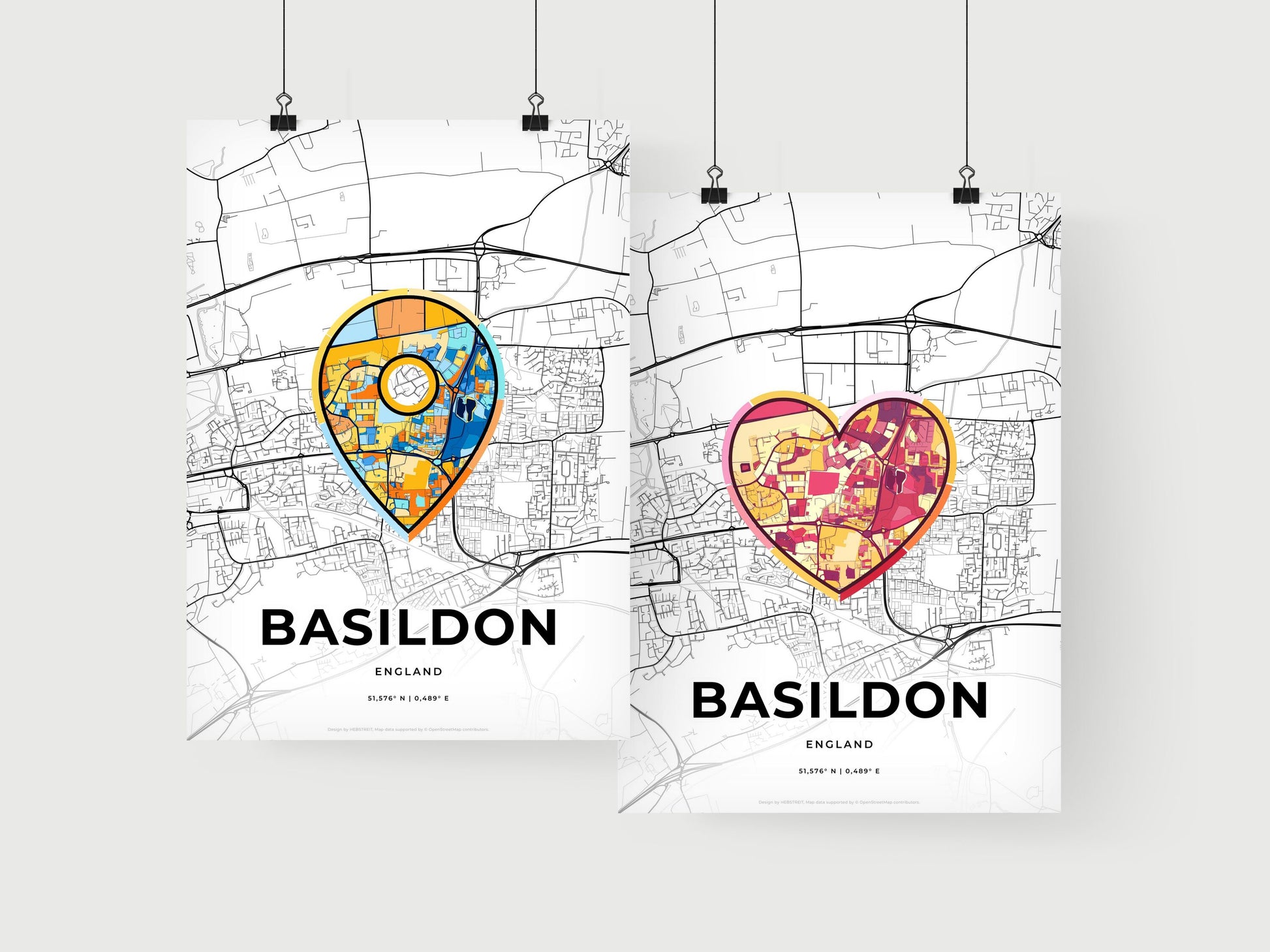 Our map of Basildon England shows minimalist designed roads, railroads and waterways combined with colorful urban areas within one icon.