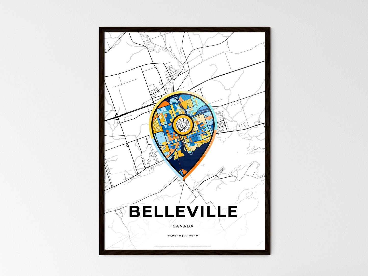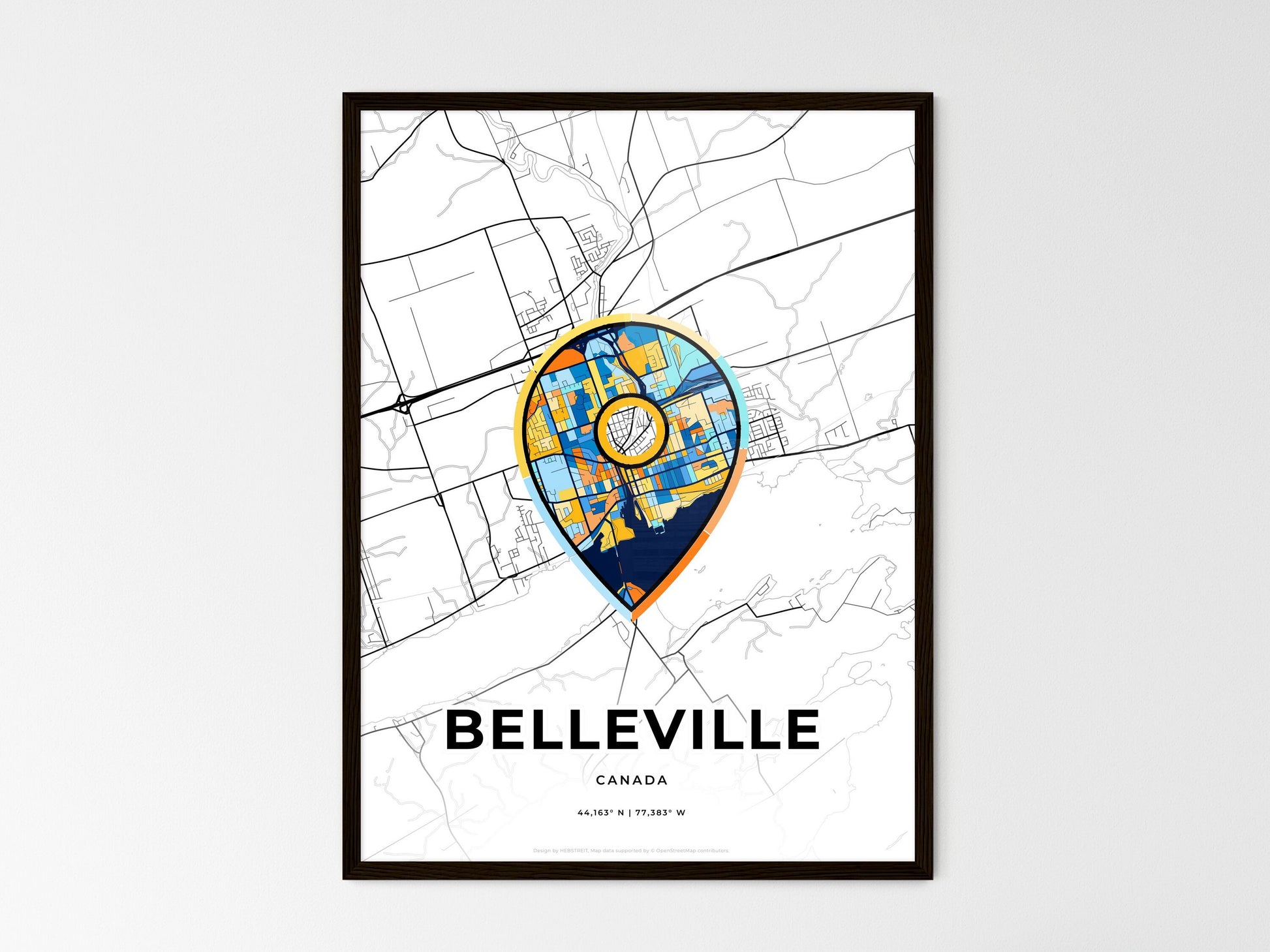 Our map of Belleville Canada shows minimalist designed roads, railroads and waterways combined with colorful urban areas within one icon.