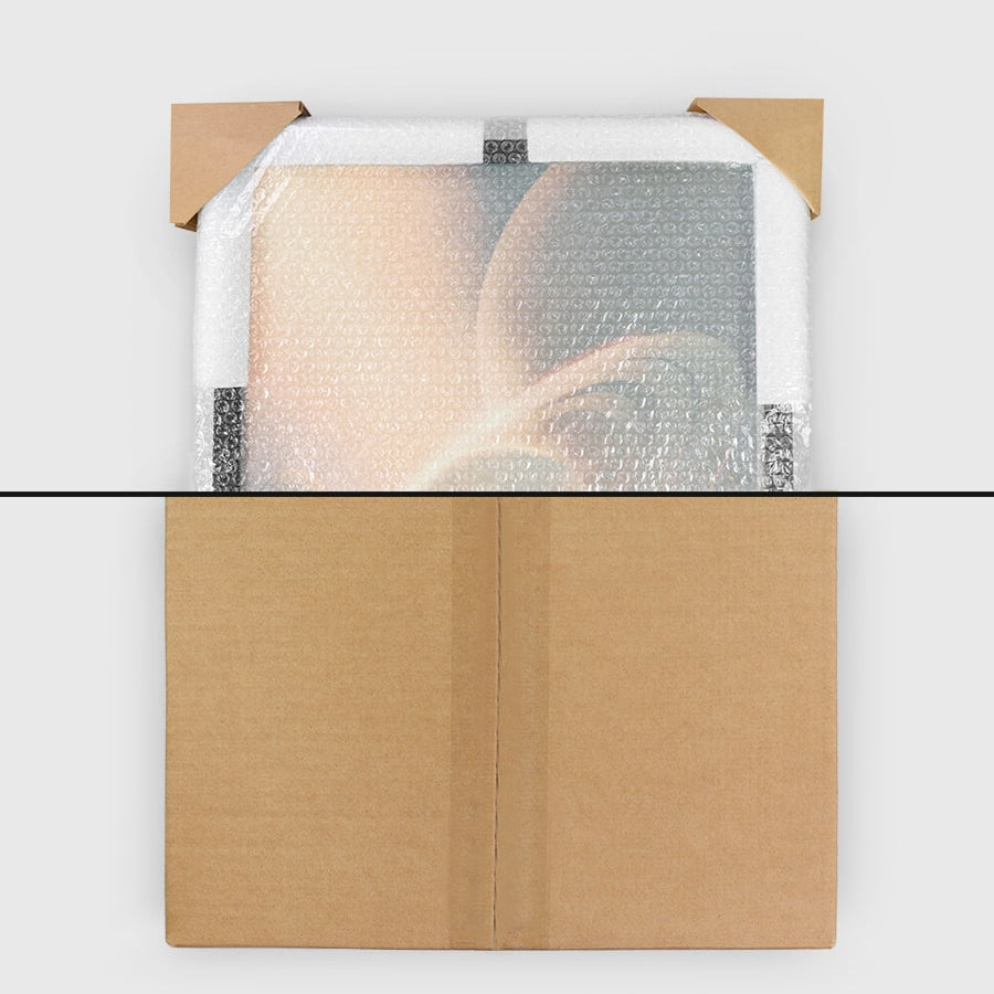Our wooden frames comes with plexiglass and backing. The printed poster is not mounted in the frame at the time of delivery. The plexiglass used may have a protective film applied to both the front and back of the glass. The posters are packed separately in an inner cardboard folder. Insert the enclosed poster into the frame upon receipt.