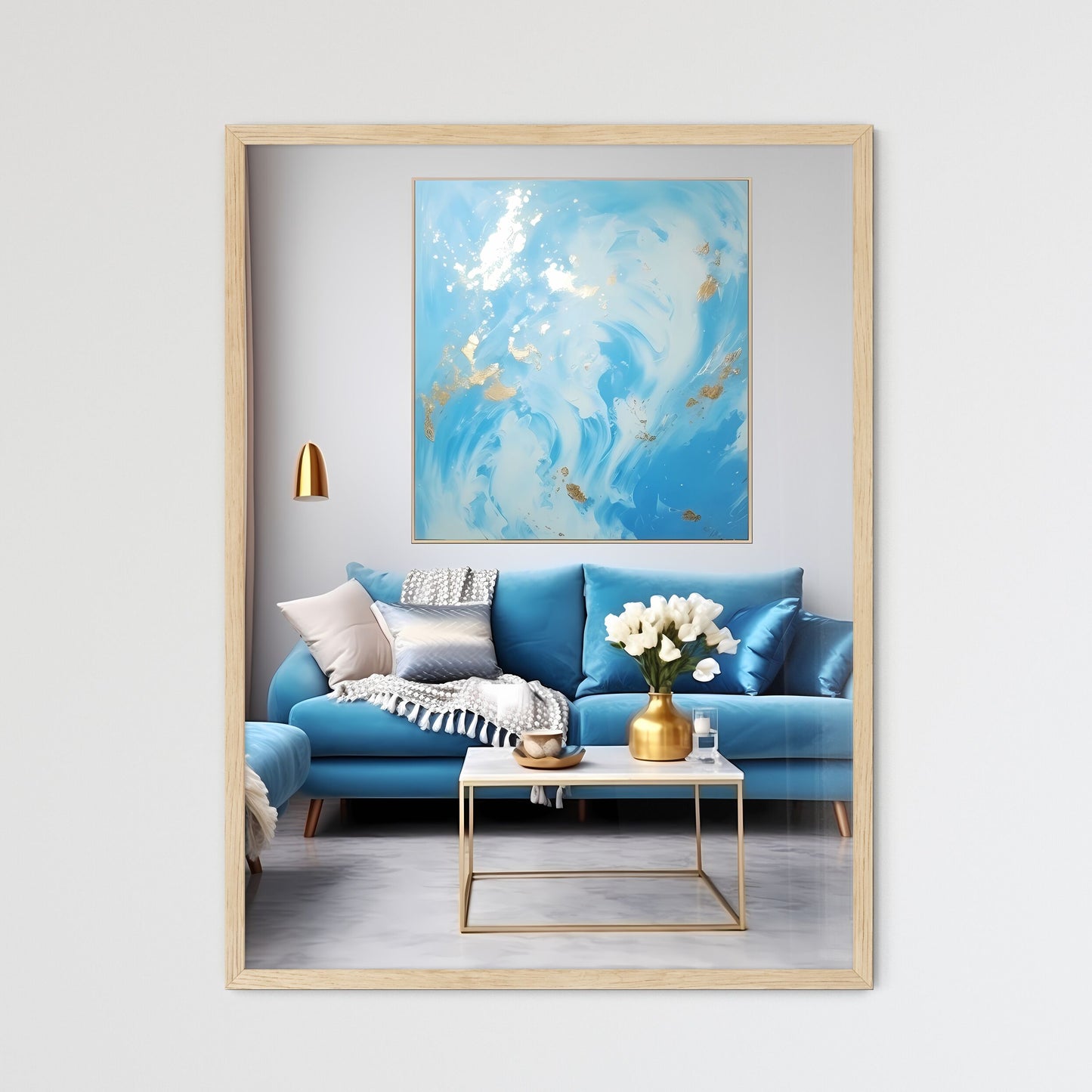 Blue And Gold Living Room With A Blue Couch And A Painting On The Wall Art Print