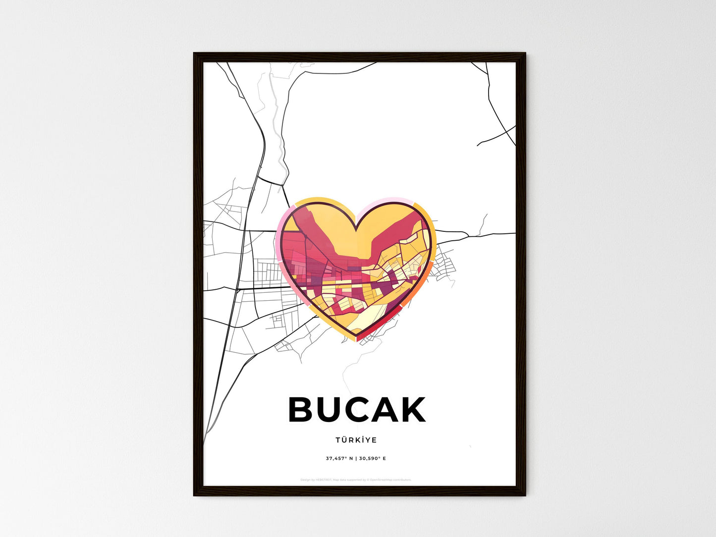 Our map of Bucak Türki̇ye shows minimalist designed roads, railroads and waterways combined with colorful urban areas within one icon.