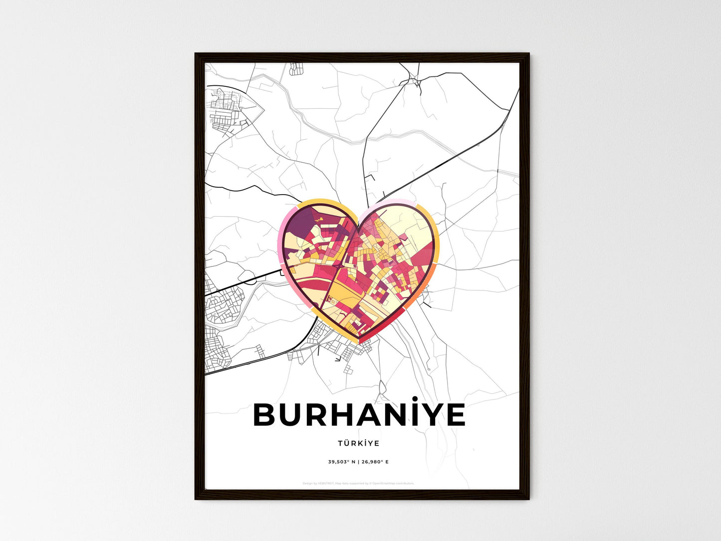 Our map of Burhani̇ye Türki̇ye shows minimalist designed roads, railroads and waterways combined with colorful urban areas within one icon.