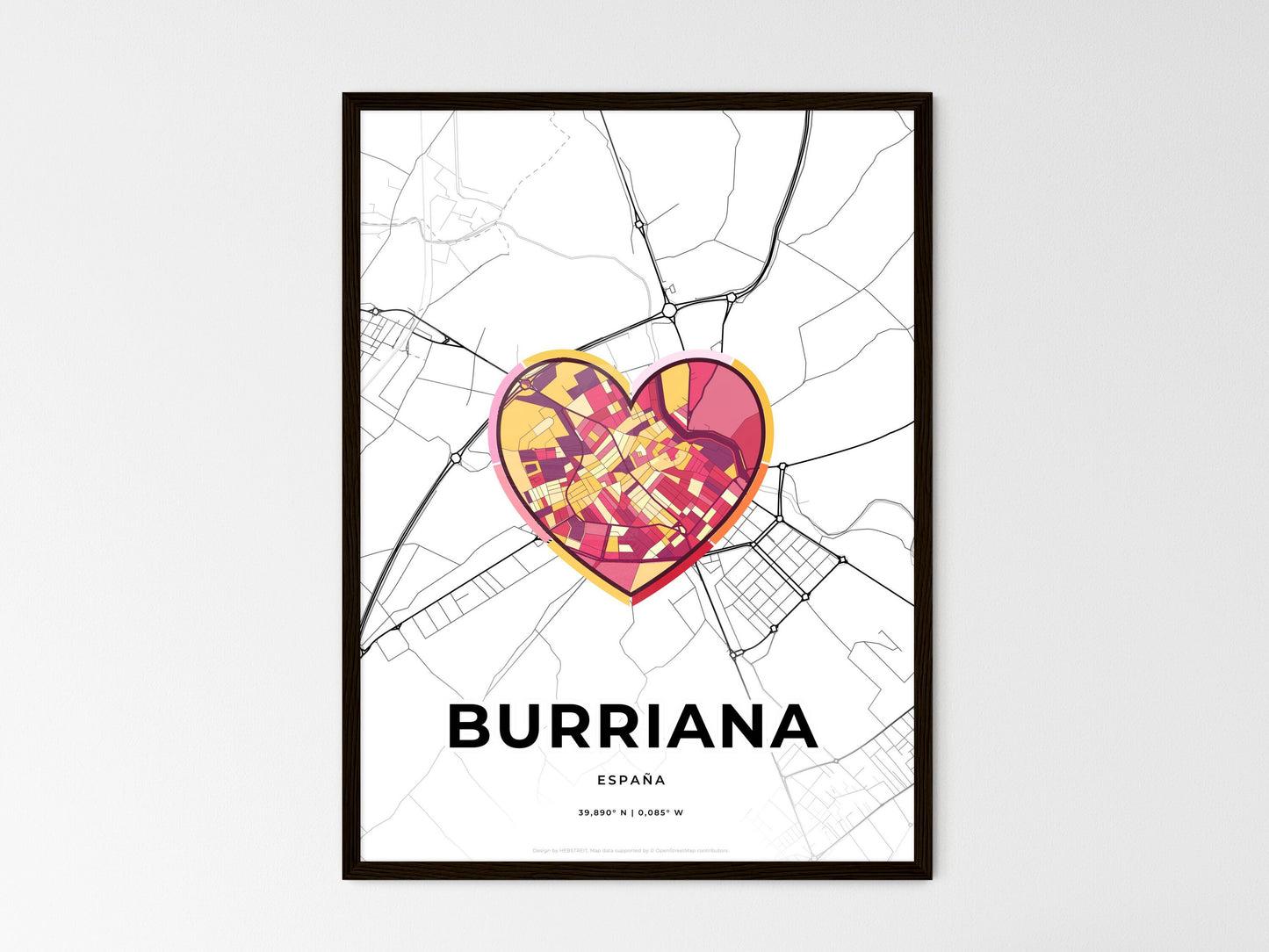 Our map of Burriana España shows minimalist designed roads, railroads and waterways combined with colorful urban areas within one icon.