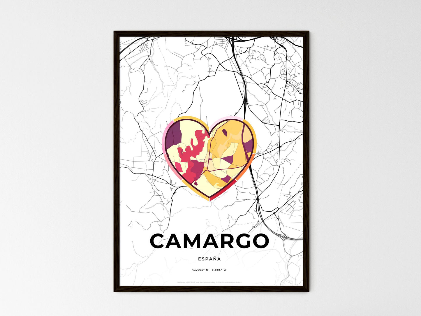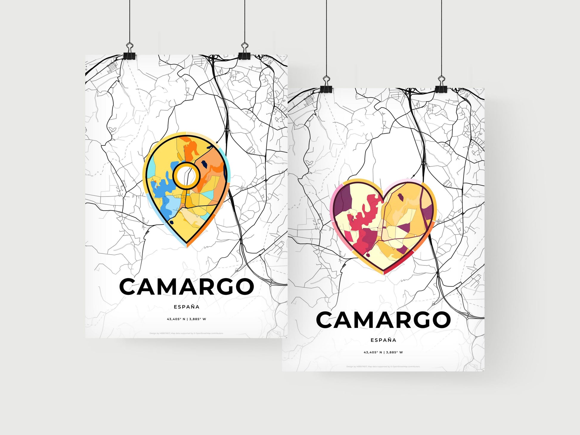 Adorned with a colorful icon, the abstract city map of Camargo, Spain unveils the vibrant essence of this captivating destination. Situated in Northern Spain, Camargo is a mesmerizing blend of history, art, and culture. Nestled amidst the scenic valleys of Cantabria, it boasts breathtaking coastal vistas, verdant hills, and an enchanting old town that narrates tales of bygone eras. The city's rich heritage is evident in the numerous historical landmarks and art galleries dispersed throughout its charming streets. Whether you're an art enthusiast or a history buff, Camargo's unique amalgamation of natural beauty and cultural treasures make it a captivating destination that will leave an unforgettable imprint on your soul.