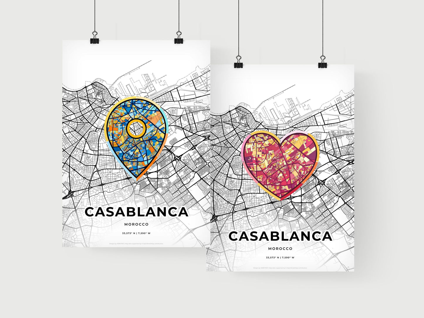 Immerse yourself in the captivating allure of Casablanca, Morocco, with this captivating abstract art map. Nestled on the Atlantic coast, Casablanca is a vibrant fusion of history, culture, and modernism. Explore its iconic landmarks through a unique artistic lens, including the majestic Hassan II Mosque, the lively Habous Quarter, and the bustling Mohammed V Square. From its enchanting medina to its art deco architecture, Casablanca invites you to delve into a world of mystery and romance. Whether you seek a thoughtful gift for a loved one or a vibrant addition to your own abode, this minimal art map captures the essence of Casablanca's enigmatic spirit, reminding you of its enduring charm.